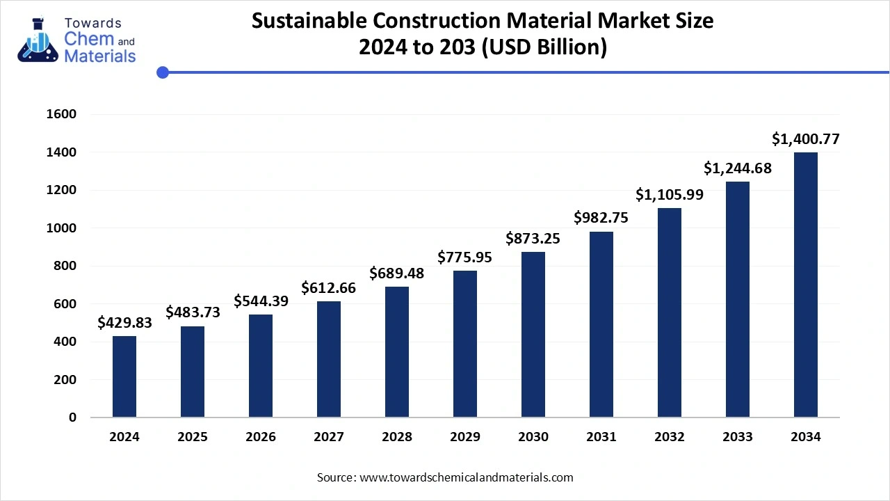 According to Towards Chemical and Materials, the global sustainable construction material market size is calculated at USD 483.73 billion in 2025 and is expected to be worth around USD 1,400.77 billion by 2034, growing at a compound annual growth rate (CAGR) of 12.54 % over the forecast period 2025 to 2034.